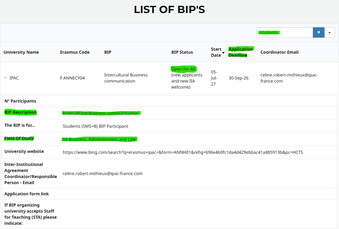 Aktuálnu ponuku BIP programov nájdete na webovej stránke univerzity alebo fakulty. Zároveň si môžete prezrieť prehľad BIP programov ponúkaných rôznymi univerzitami na jednom mieste. Pri výbere venujte pozornosť správnemu filtrovaniu – zamerajte sa na programy určené pre študentov, ktoré sú otvorené pre všetky univerzity (nielen pre partnerské inštitúcie).